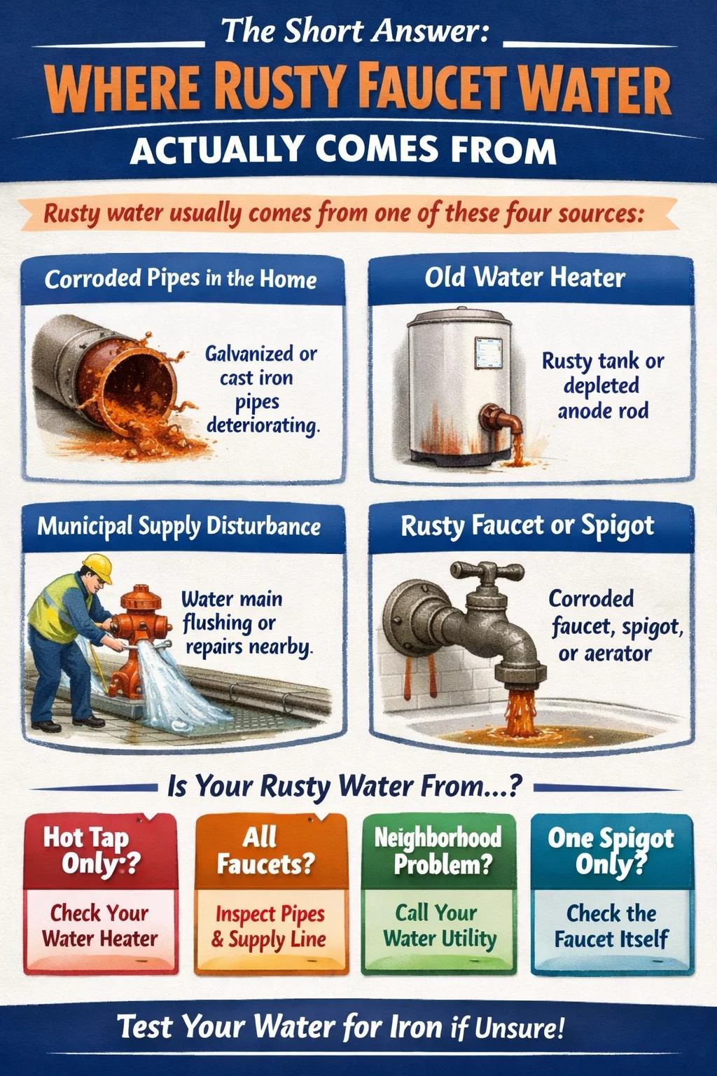 Ang kalawang na tubig mula sa mga gripo ay halos palaging sanhi ng isa sa apat na pinagmumulan: mga corroded na bakal o bakal na tubo sa loob ng iyong tahanan, isang lumalalang pampainit ng tubig, pagkagambala ng sediment sa linya ng supply ng munisipyo, o isang oxidized na spigot o fixture sa punto ng paghahatid. Ang kulay kahel, kayumanggi, o mapula-pula na tint na nakikita mo ay iron oxide — kalawang — na maaaring natuklap mula sa loob ng mga tubo at pumasok sa agos ng tubig, o direktang natunaw sa tubig habang ito ay naglalakbay sa luma na imprastraktura.