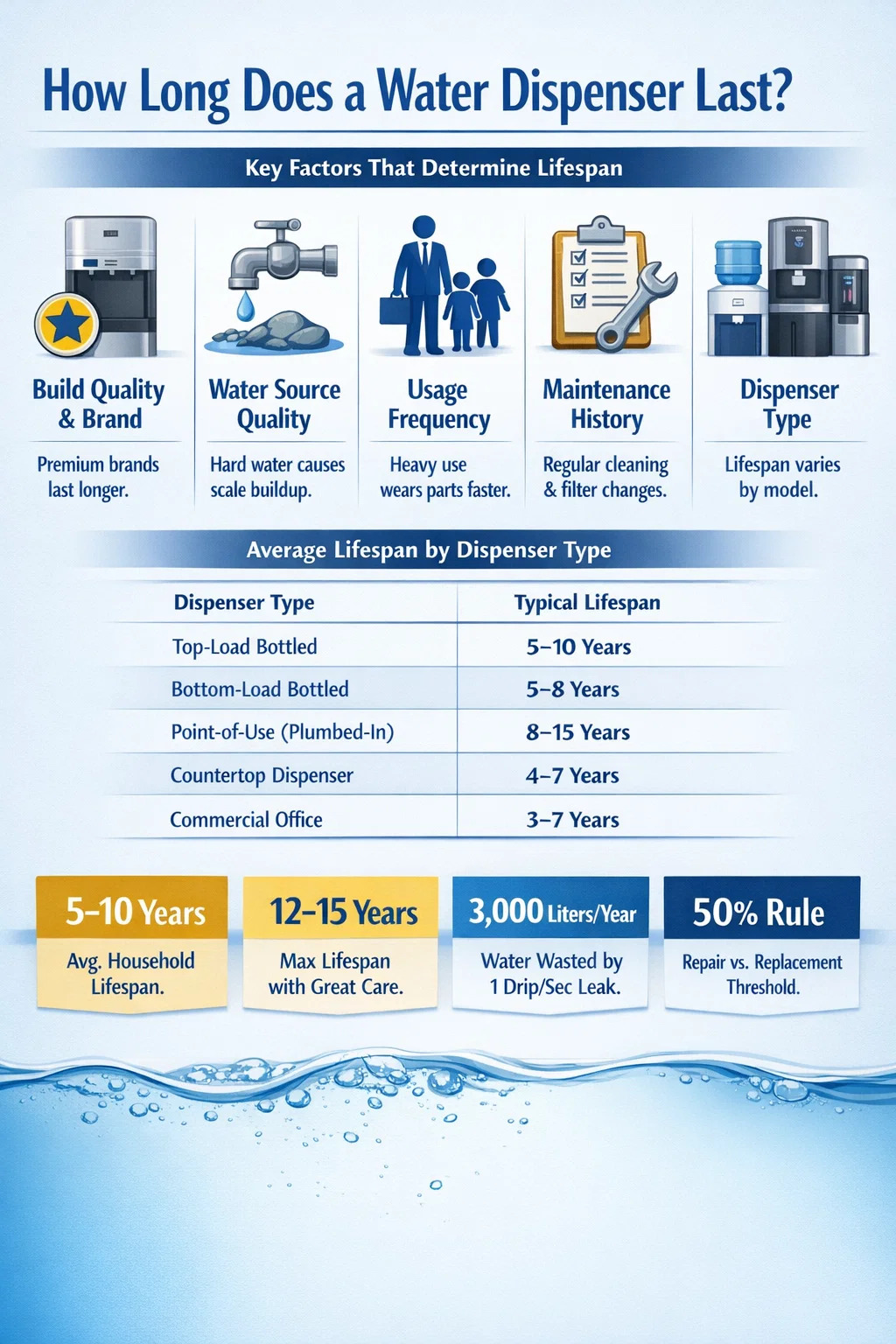 | Bottom-load na de-boteng dispenser | 5–8 taon | Kabiguan ng pump motor |
