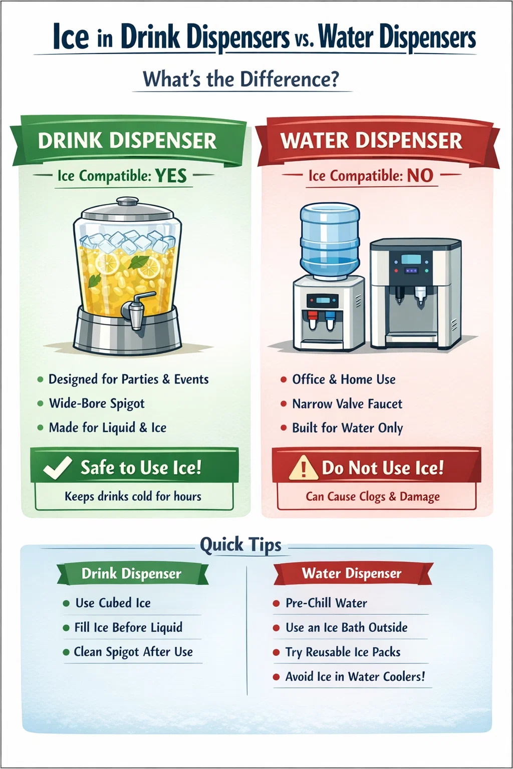 Oo, maaari kang maglagay ng yelo sa isang dispenser ng inumin — ngunit kung dapat kang magdepende nang buo sa disenyo ng dispenser at nilalayon na paggamit. Ang mga dispenser ng inumin na ginawa para sa pagtutustos ng pagkain, mga party, at mga restaurant ay partikular na ginawa upang maglagay ng yelo kasama ng mga inumin. Ang mga karaniwang water dispenser at countertop na mga water cooler, gayunpaman, ay hindi idinisenyo para sa yelo, at ang pagdaragdag nito ay maaaring makapinsala sa faucet ng dispenser ng tubig, makabara sa mekanismo ng spigot, at maging sanhi ng pagtagas. Ang pag-alam kung saang kategorya nabibilang ang iyong dispenser — at kung paano gumamit ng yelo nang ligtas kung ito ay tugma — ay may malaking pagkakaiba sa kung gaano katagal ang kagamitan at kung gaano ito gumagana.