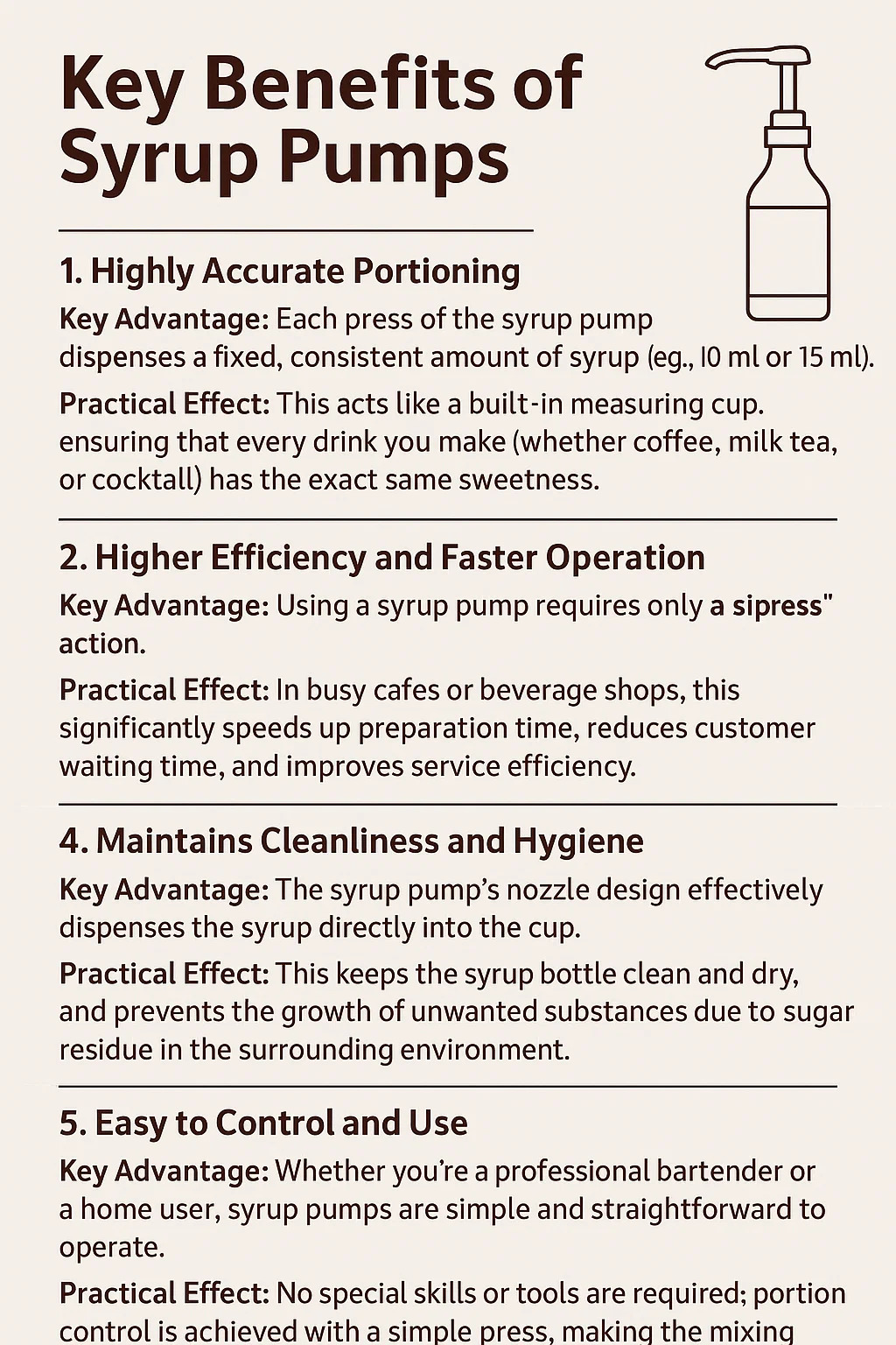 Pangunahing bentahe: Ang paggamit ng isang pump ng syrup ay nangangailangan lamang ng isang solong ** "pindutin" ** na pagkilos, pagtanggal ng maraming mga hakbang tulad ng pagbubukas ng bote ng takip, pagbuhos, paghahanap ng isang pagsukat ng tasa, at pagkatapos ay isara ang takip.