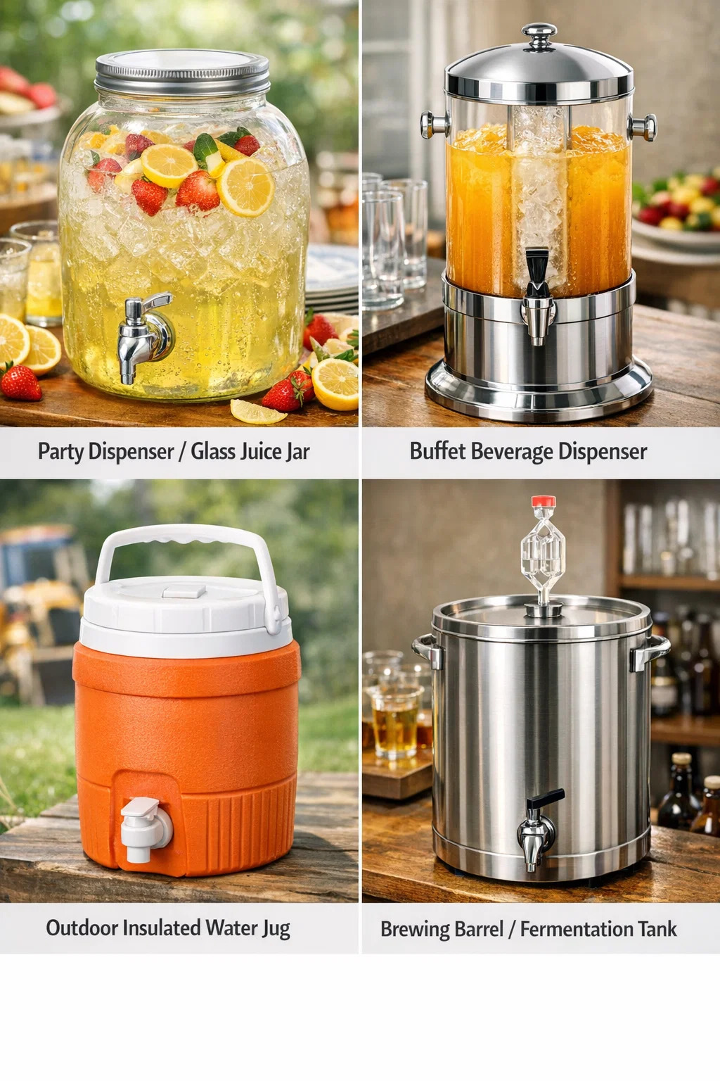 Sa ating pang-araw-araw na buhay, ang mga lalagyang ito na may maliit na gripo, kung saan nagtitipon ang mga tao upang kumuha ng mga inumin, ay may iba't ibang pangalan depende sa kanilang hitsura at gamit. Kung maghahanap ka online o magtanong sa isang tindahan, ang paggamit ng mga sumusunod na pangalan ay tiyak na magbibigay sa iyo ng tamang resulta: