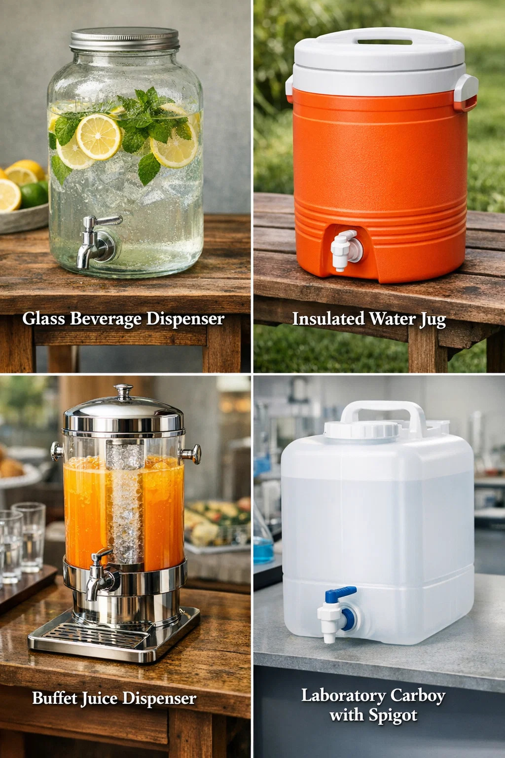 Ang ganitong uri ng lalagyan ng inumin na may spigot (faucet/tap) ay may maraming iba't ibang pangalan sa pang-araw-araw na buhay, depende sa hugis, materyal, at konteksto kung saan ito ginagamit.
