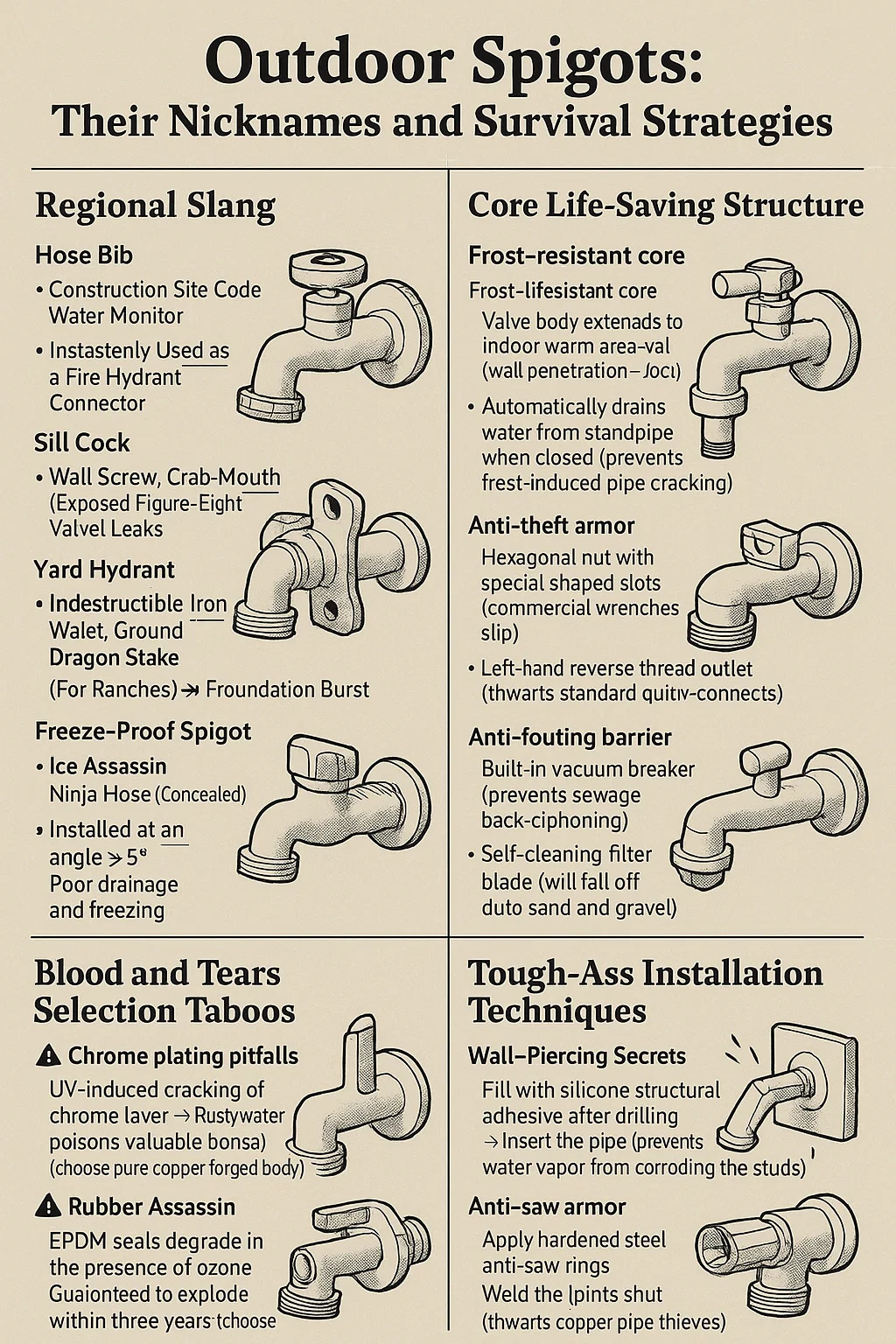 | Bakuran hydrant | Frost-Proof Iron Guts | Gopher Stick (Ranch Spec) | Nawawalang balbula ng alisan ng tubig → freeze-burst foundation |